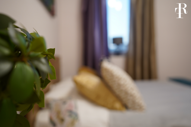 The opulent bathroom features an integrated TV, marble-effect porcelain, and gold mosaic niches, while the three serene bedrooms exude a luxury hotel feel. Soft textured wallpaper, tactile satin-effect carpeting, and a dark, sophisticated walk-in wardrobe complete this exquisite home.
