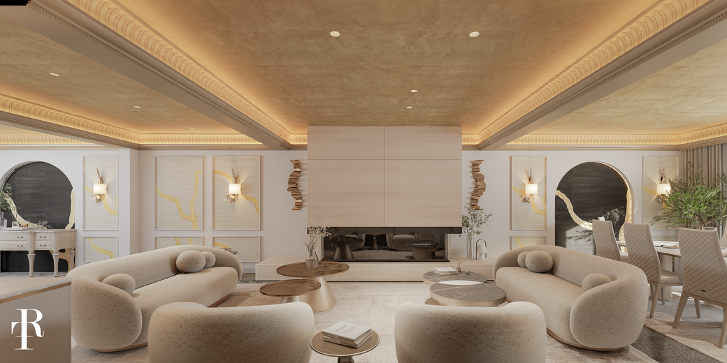 This impeccably curated open-plan living and dining space blends contemporary luxury with timeless elegance. A soft, neutral palette is elevated by opulent gold accents and rich textures. The sculptural boucle sofas, adorned with spherical cushions, create a sense of organic fluidity, complemented by brushed gold and marble coffee tables. Striking wall features include LED-lit arches, dramatic black wood panels with gold leaf detailing, and elegant wall profiles with textured wallpaper and statement wall lights. The gold-leaf ceiling, enhanced by LED coving, casts a warm, ambient glow, enriching the architectural detailing. A central fireplace feature with a sleek, minimalist facade serves as a focal point, seamlessly dividing the living and dining areas. In the dining space, quilted high-back chairs frame a sophisticated dining table, set against arched alcoves and decorative sconces. This design masterfully balances grandeur and intimacy, creating a refined yet inviting atmosphere.