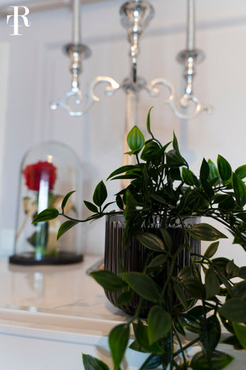 Bathed in a warm, ethereal glow, this interior is a masterpiece of neoclassical elegance infused with contemporary refinement. LED arches star as the wow feature of this design, their soft radiance accentuating the black veneer wallcover, which exudes depth and sophistication. A bespoke golden leaf tree branch design stretches across the walls, its organic form mirrored in the brassy wall lights, casting intricate shadows that dance upon the pastel wallpaper. The limestone fireplace stands as a stately centerpiece, its timeless allure complemented by linen French classical sofas adorned with matching cushions in hues of gradient pink to peach. Soft carpet finishing underfoot enhances the inviting ambiance, while wall profiles echo the delicate transition of color, harmonizing effortlessly with the rich black wall covers. Above, the LED coving ceiling glows in a subtle light gold shade, further immersing the space in refined opulence. This interplay of textures and tones transports one to the serene grandeur of the French Riviera.